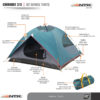 – DOUBLE LAYER FULL COVERAGE RAINFLY – 100% waterproof 190T polyester laminated with polyurethane. 2500mm water column rainfly provides full coverage, while the heat-seamed thermoplastic coating offers UV protection. The inner tent has a large 2-way zipper D-style door with full mosquito mesh protection. Roomy utility pocket and gear loft for storage and ventilated mesh roof.