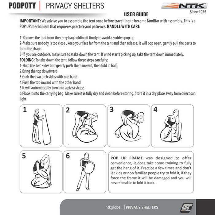 – DESIGNED FOR QUICK & EASY ASSEMBLY – The NTK PODPOTY privacy shelter is great for all the family. With easy assembly, this collapsible lightweight privacy tent weighs 3.3lbs with a comfortable floor size of 3.6ft x 3.6ft and 6.2ft center height for maximum comfort and privacy.